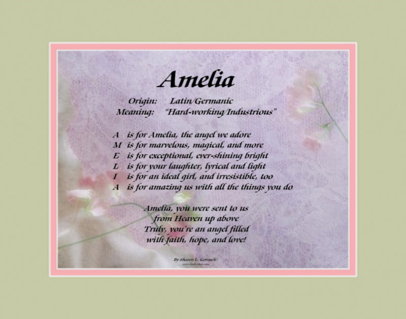 The name Amelia is of Latin and German origin and means “hard worker; industrious.” It is a blend of medieval names of Emilia and Amalia. It is believed to be a variant of Emily, and other variations include Amal, Amalia, and Emma. Also, the name “Amelia”, with its first letter of “A”, starts with the most popular first letter of girls’ names in America (followed in order by “E” and “M”).